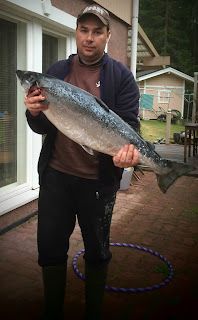 Perille päästyä suoraan joelle missä serkku odottikin jo. Pikaiset kuulumisen vaihdot ja sitten valitsemaan vaaput mitkä ensinmäiselle soutusessiolle pyyntiin. Vielä pienet säädöt vaapuille rannassa ennen kuin lähdettiin ajamaan pelipaikoille. Kerittiin soutaan noin viisiminuuttia kun vapa taipui ensinmäisen kerran ja siitä reilun kymmenen minuutin jälkeen 9.4kg lohi kyytiin.